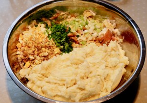 When they’ve let off a bit of steam, mash, cool and add to the mixing bowl.
