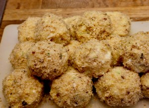 Divide the mixture into equally sized balls – I use an ice cream scoop. Coat with the egg and then roll in the seeded breadcrumb mixture. Lay as many as you need to serve on a lined baking tray and spray with oil. Pop into the oven (Gas 6/200) for 30 minutes or until golden. Put the rest in a storage container and keep in the freezer until needed.