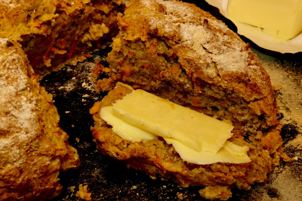 Stir in the carrots and walnuts and lastly add the buttermilk which will bring it all together in a soft dough. tip the dough on a floured surface, pat into a gentle round shape and pop on the patiently waiting baking sheet. Sprinkle with wholemeal flour and cut a deep cross on the top surface.