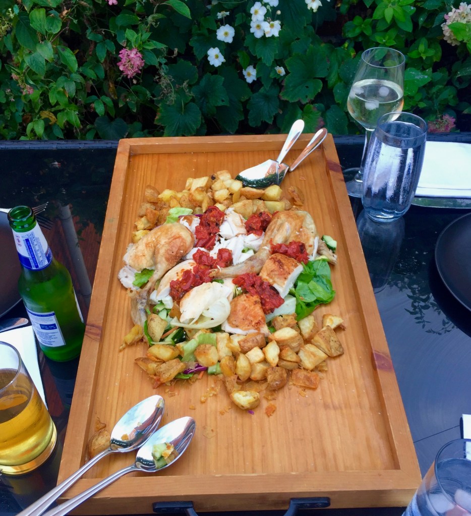 Carve the chicken into chunks and place over the leaves. Season and dress with the tomatoes and garlic, slightly warmed (I use the microwave).