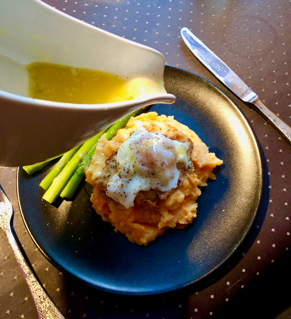 Today, a fast and healthy brunch of leftover root vegetable monster mash, a small pan fried fillet of smoked haddock, topped with a poached egg and a side of steamed asparagus.